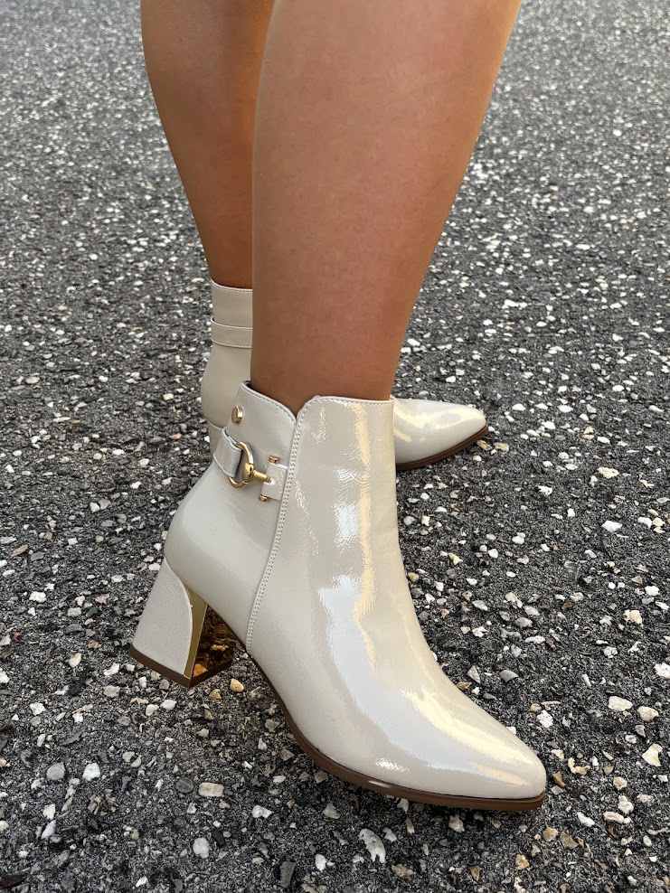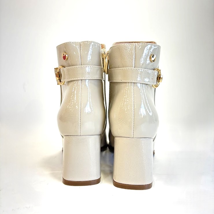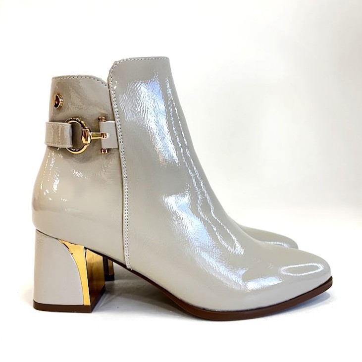 Bota senhora clássica,verniz beje com aplicação em dourado, forma fina e salto largo 6cm forrado á cor com aplicação em dourado. Fecho na lateral.