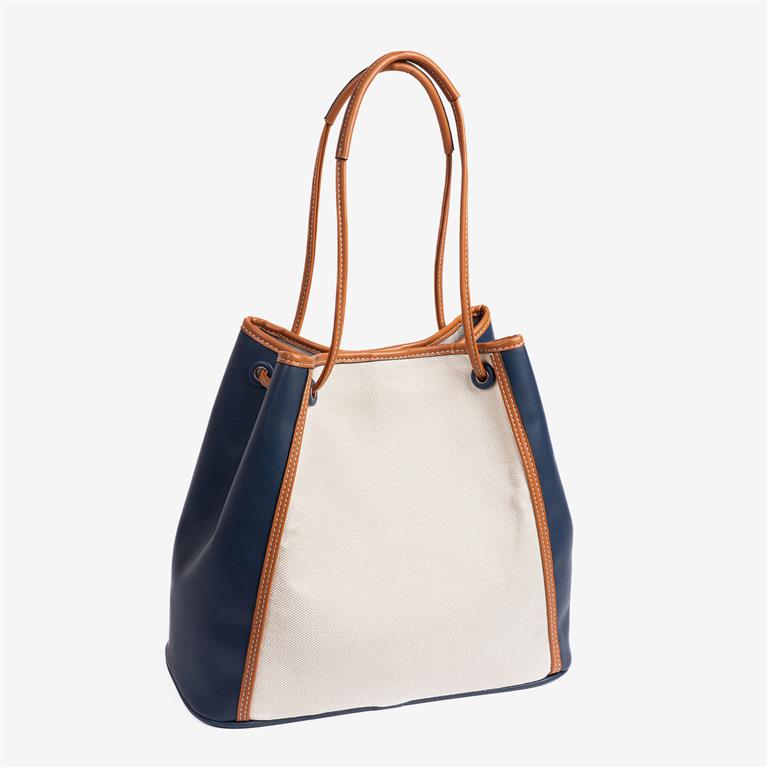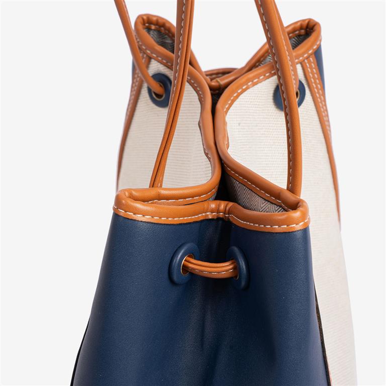 Mala senhora, na combinação de cores em beje c/ azul. Acabamento em lona de alta qualidade. Interior com forro têxtil e bolso com fecho. Na parte de trás, há um bolso com fecho.