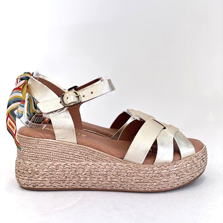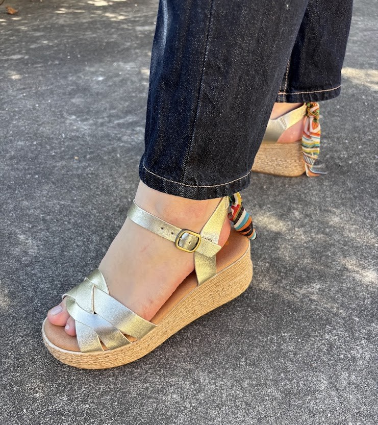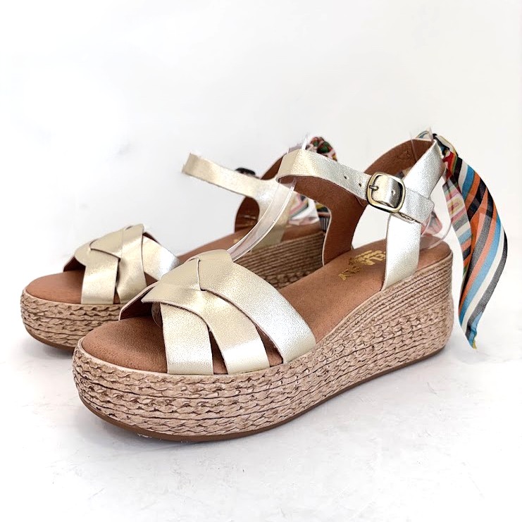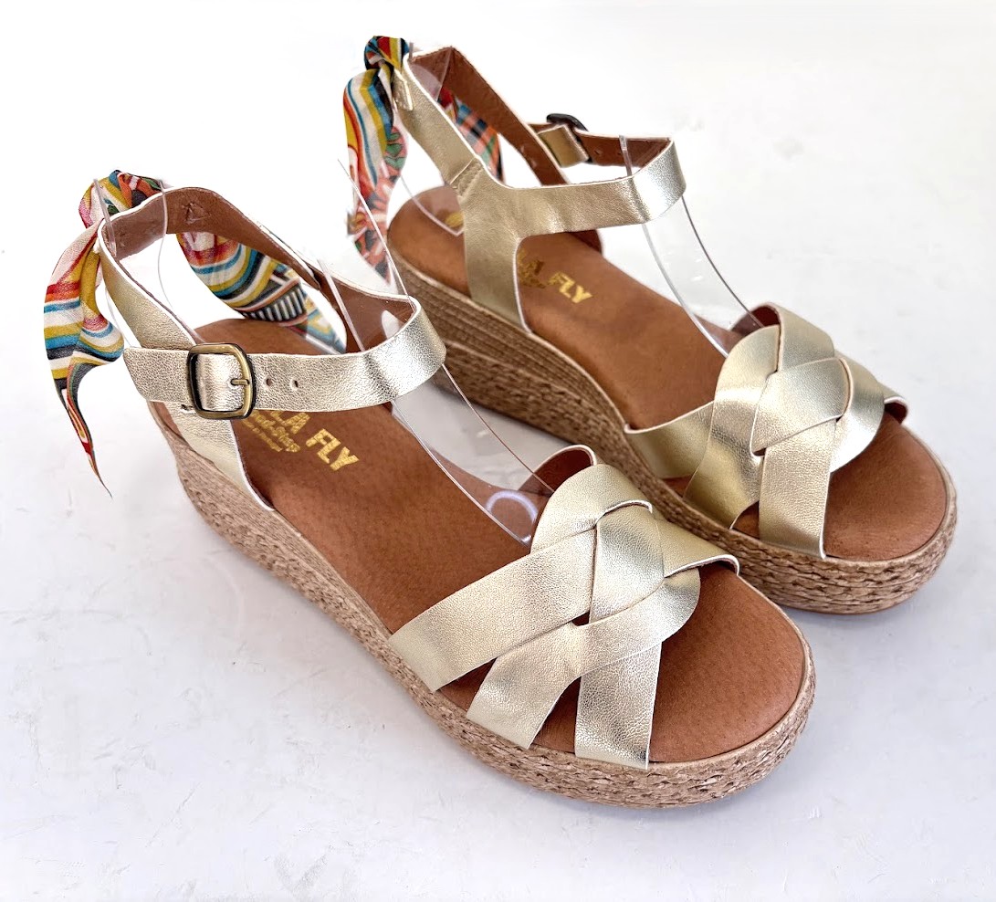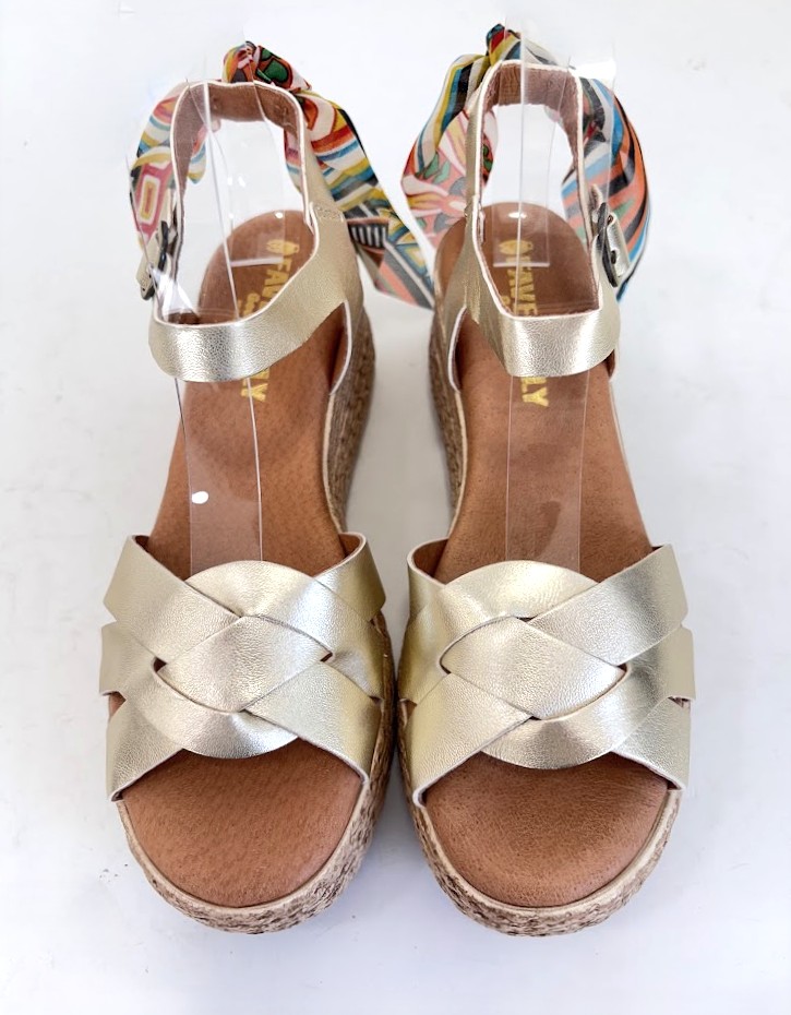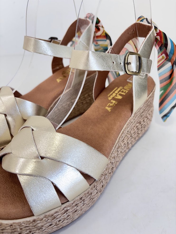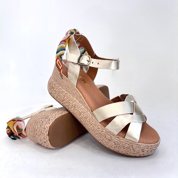 Sandálias de Senhora FABRICO PORTUGUÊS em pele dourada, com pormenor de lenço multicolor na parte de trás, com a possibilidade de retirar. Salto em cunha com inclinação ligeira. Palmilha de conforto, almofadada e em pele. A forma de apertar com passadeira e fivela na lateral para um ajuste mais rápido. A sola imitação de corda e é em borracha leve.