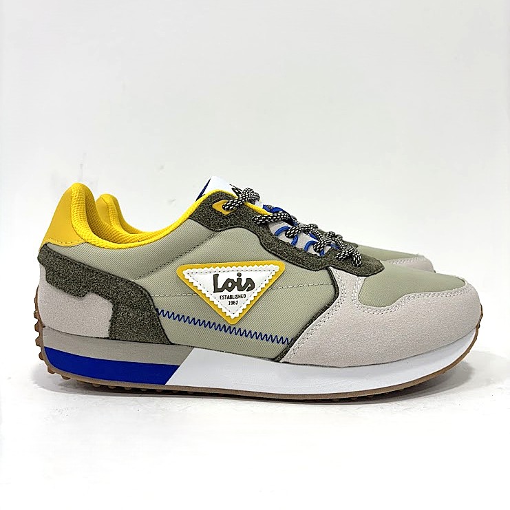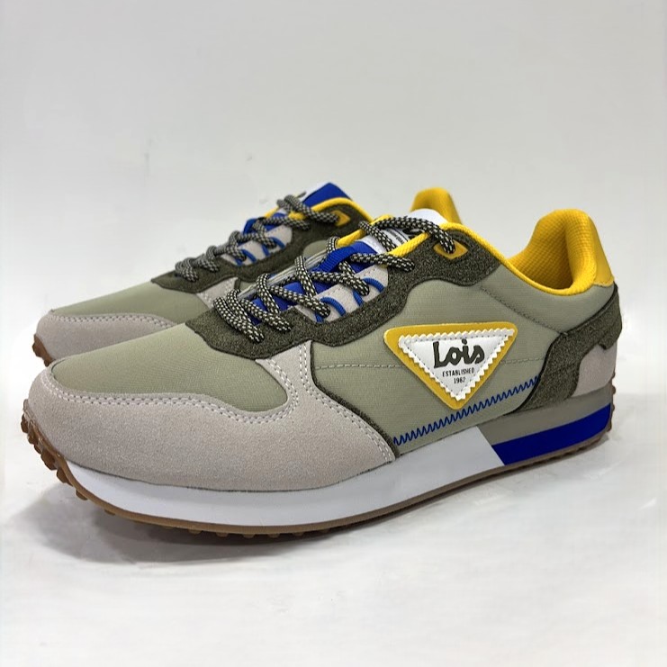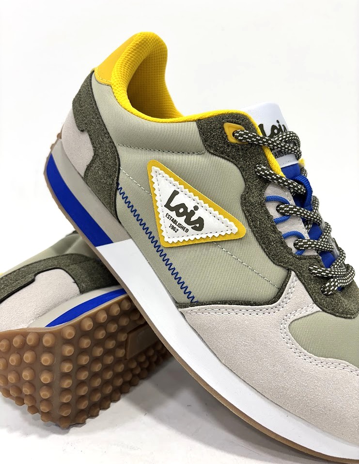 Sapatilhas da marca– LOIS fabricadas em material têxtil tons de verde, com apontamentos em azul, amarelo e camurça. Fecho com cordões ajustáveis. Sola em eva/borracha antiderrapante.
