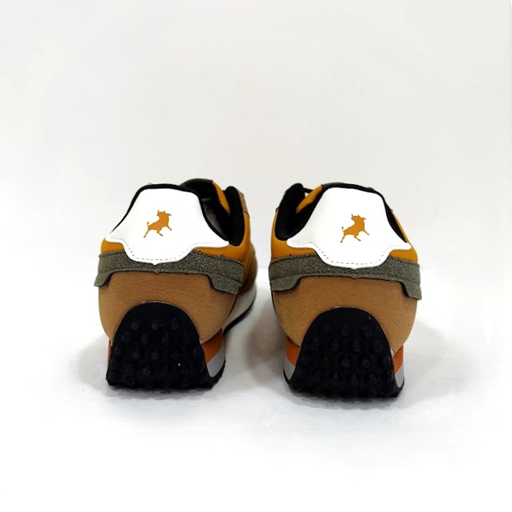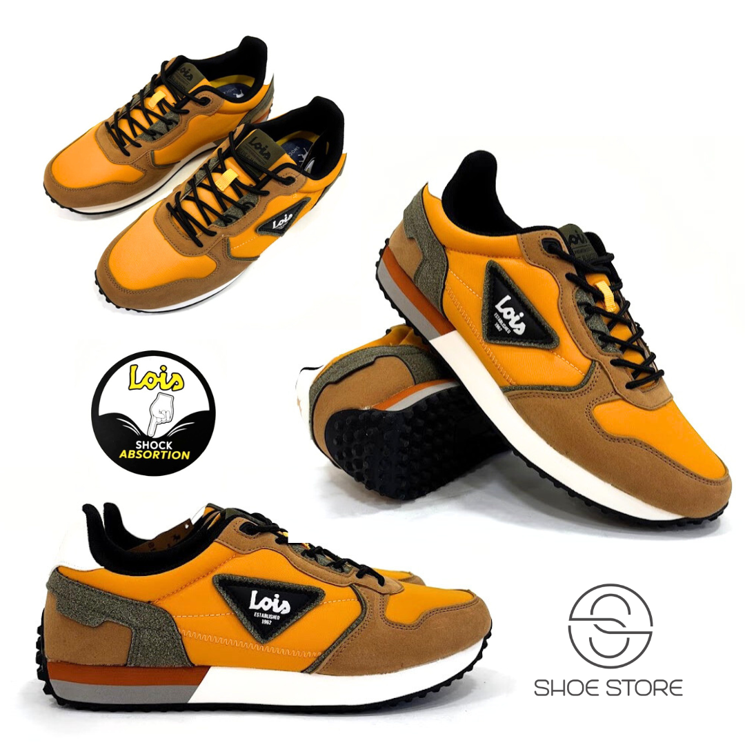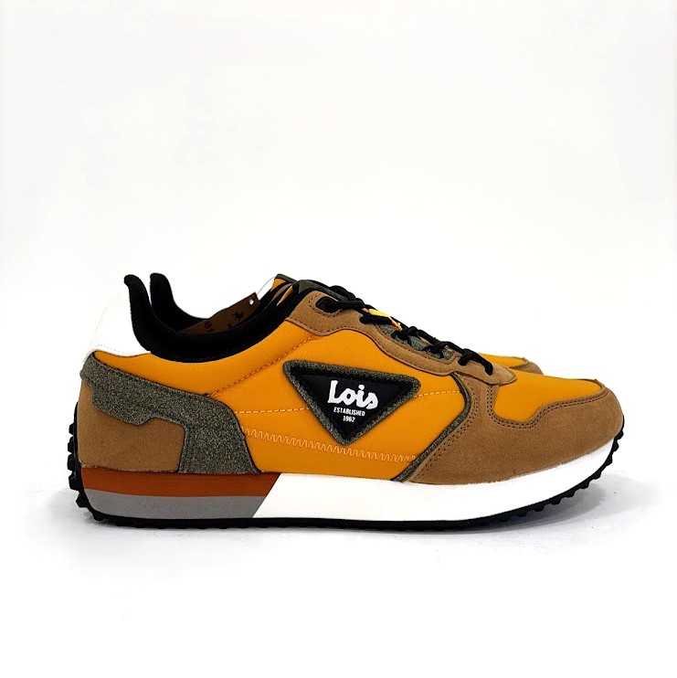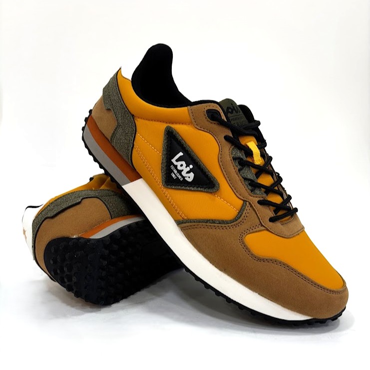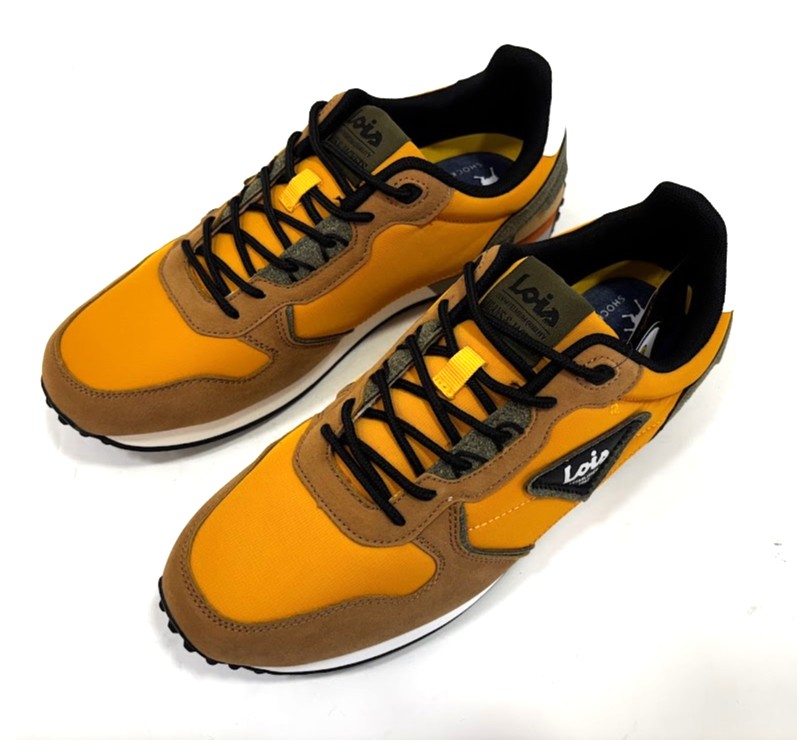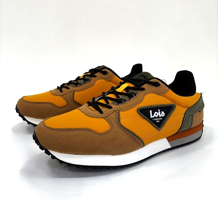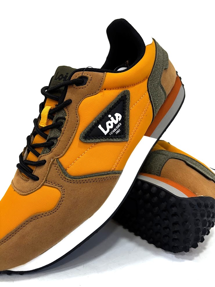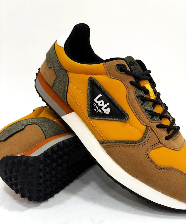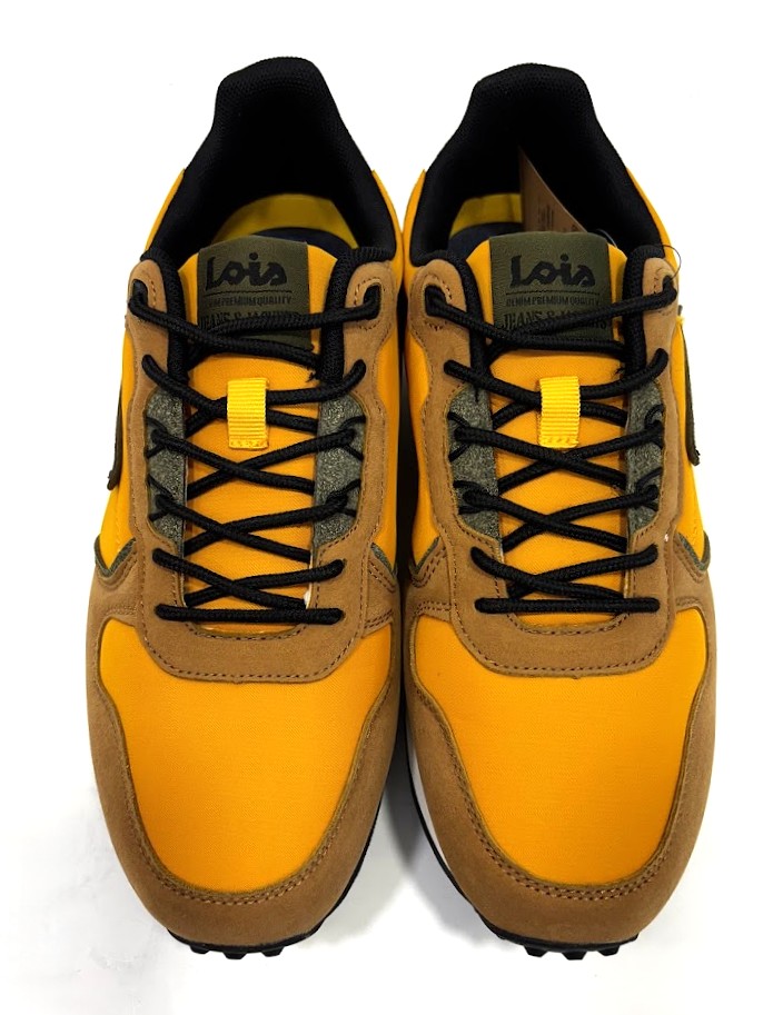 Sapatilhas da marca– LOIS fabricadas em material têxtil em tons amarelo mostarda, com apontamentos em camurça camel e kaki. Fecho com cordões ajustáveis. Sola em eva/borracha antiderrapante.
