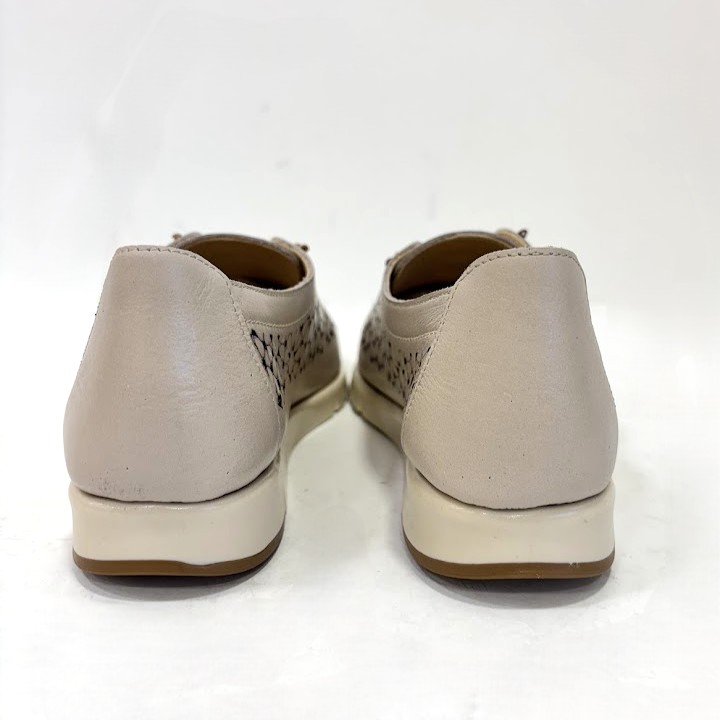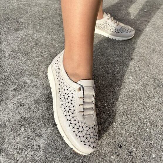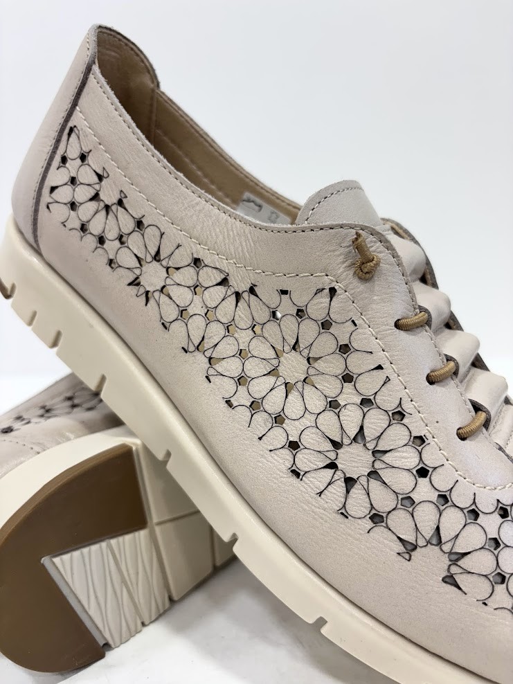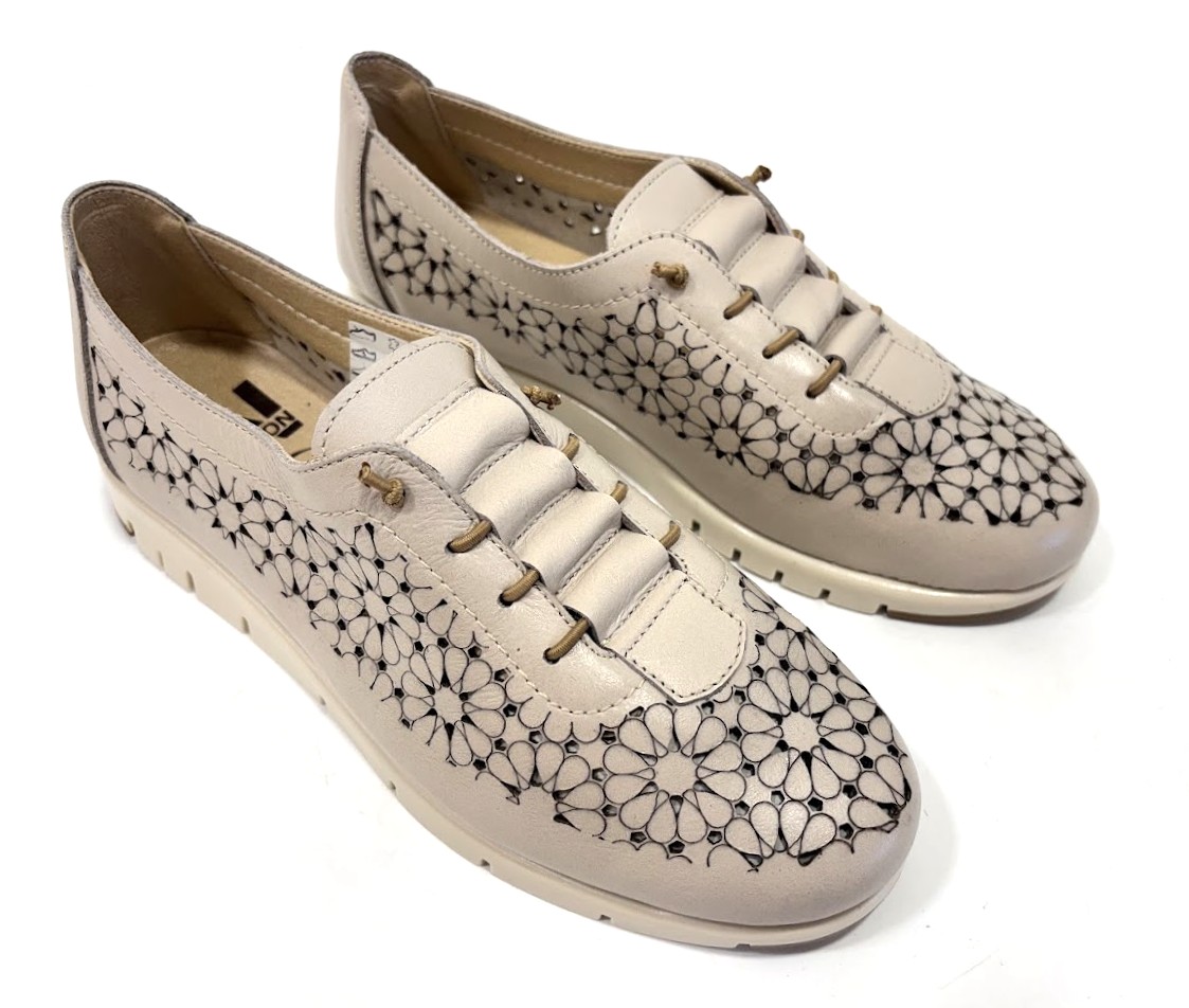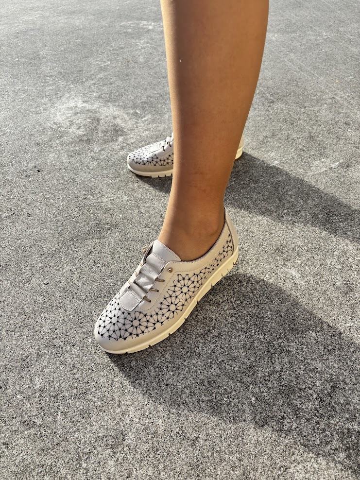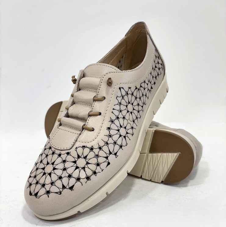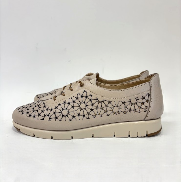 Sapato senhora desportivo, em pele perfurada (laser) na cor de bronze, forma de apertar com elásticos, o que facilita ao calçar, mas pode ser substituído por atacador. Palmilha almofadada e interiores a pele. sola em borracha antiderrapante.