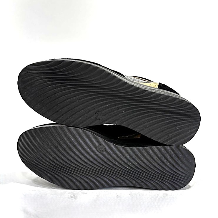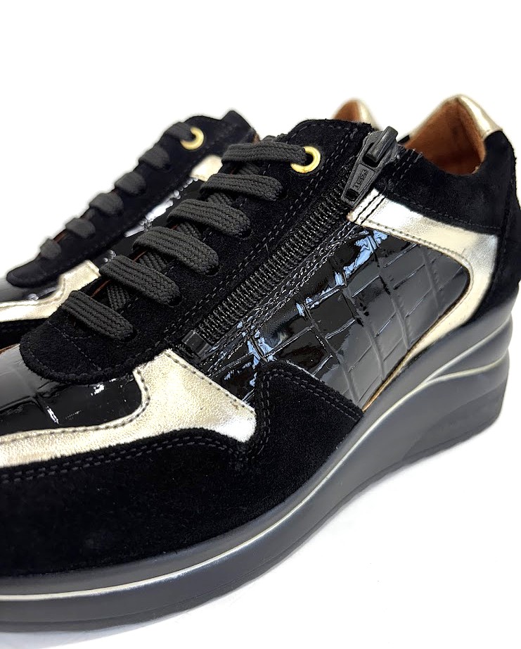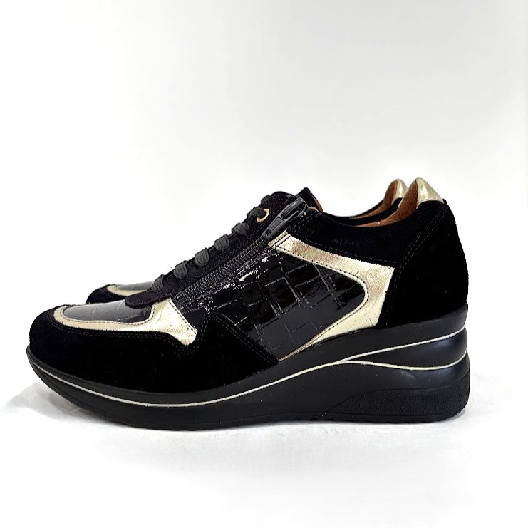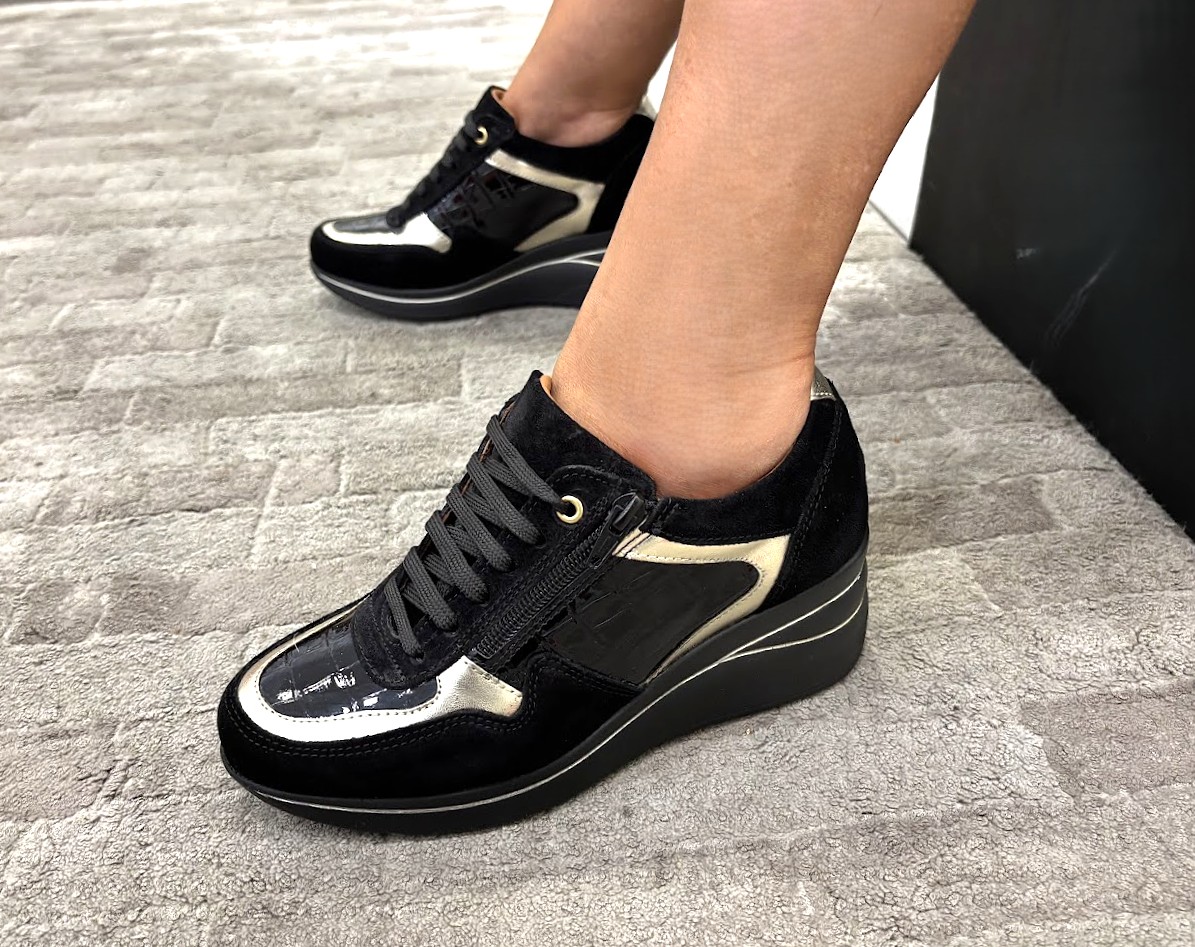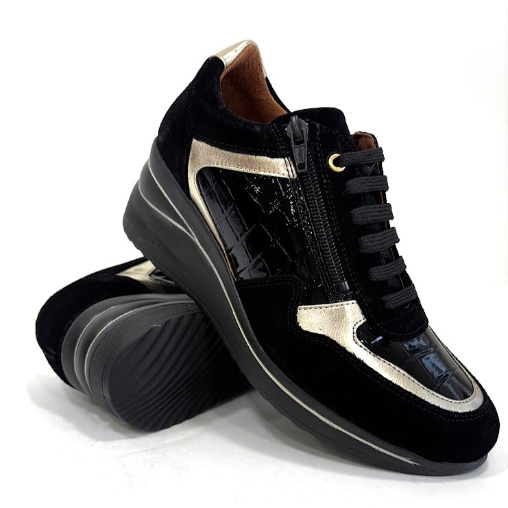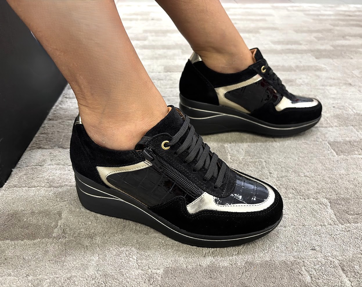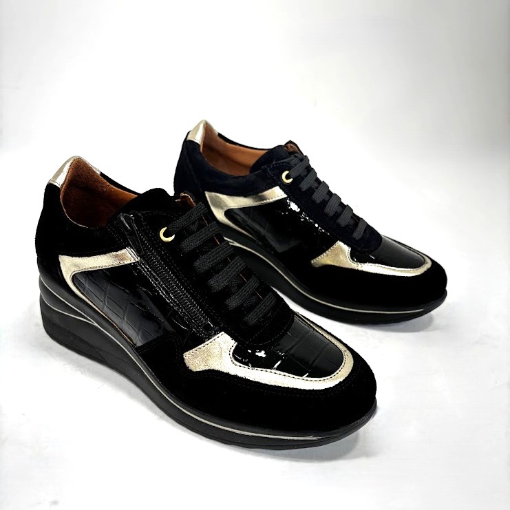 Sapato desportivo de Senhora de fabrico português,em pele,camurça e verniz com aplicações em tons de preto e dourado,forma de aperto com atacador e fecho para facilitar ao calçar,depois de ajustar o atacador basta só trabalhar com o fecho,  interior em pele, sola em cunha 5.50cm com ligeira inclinação.