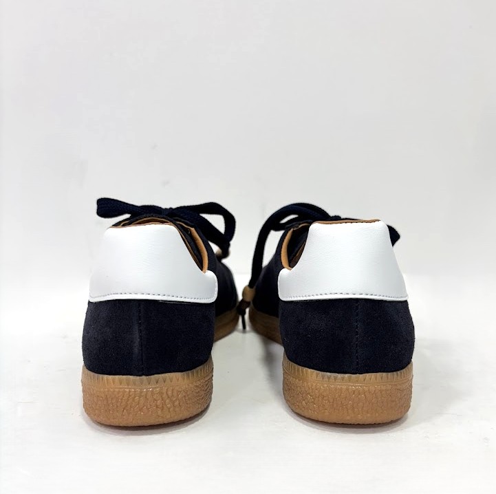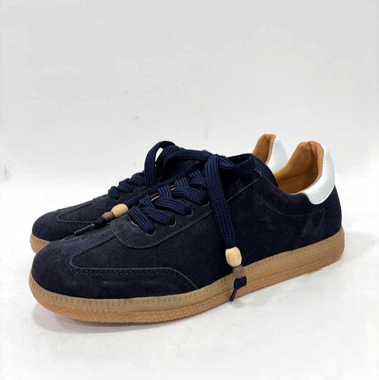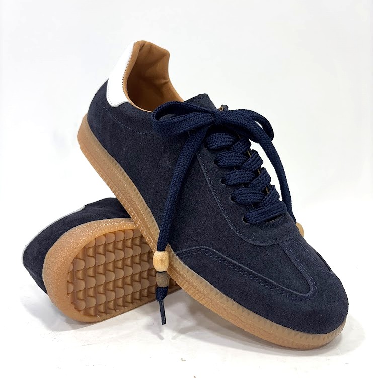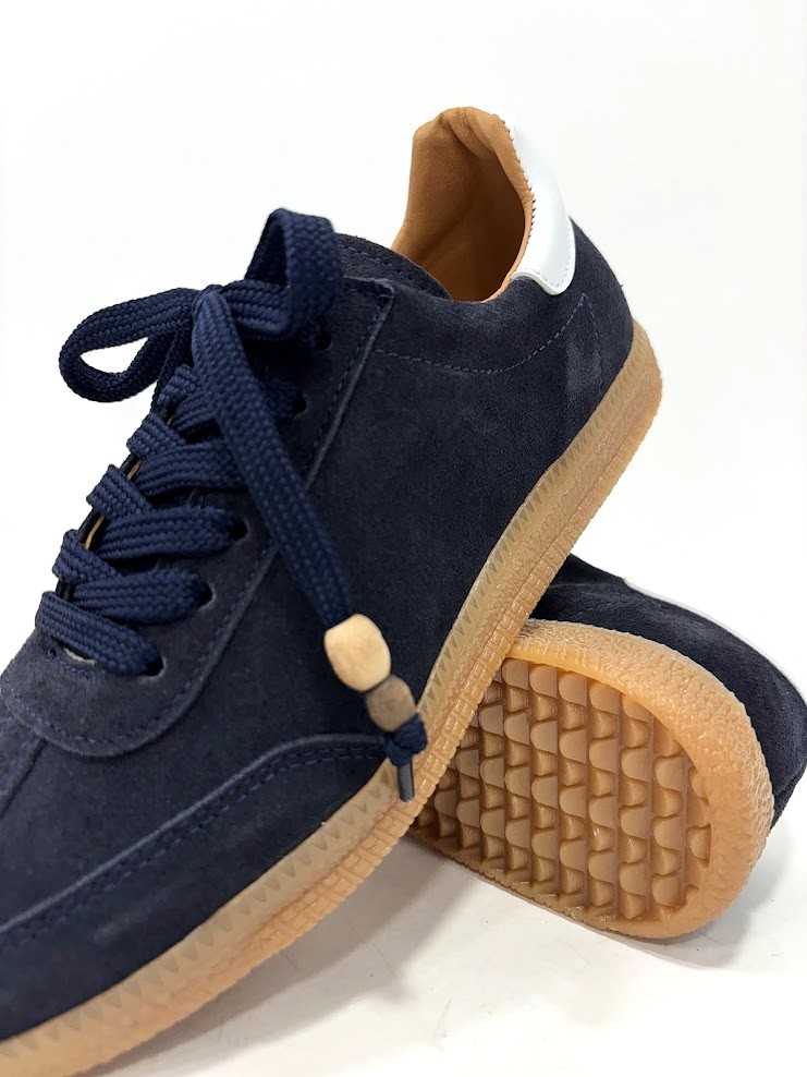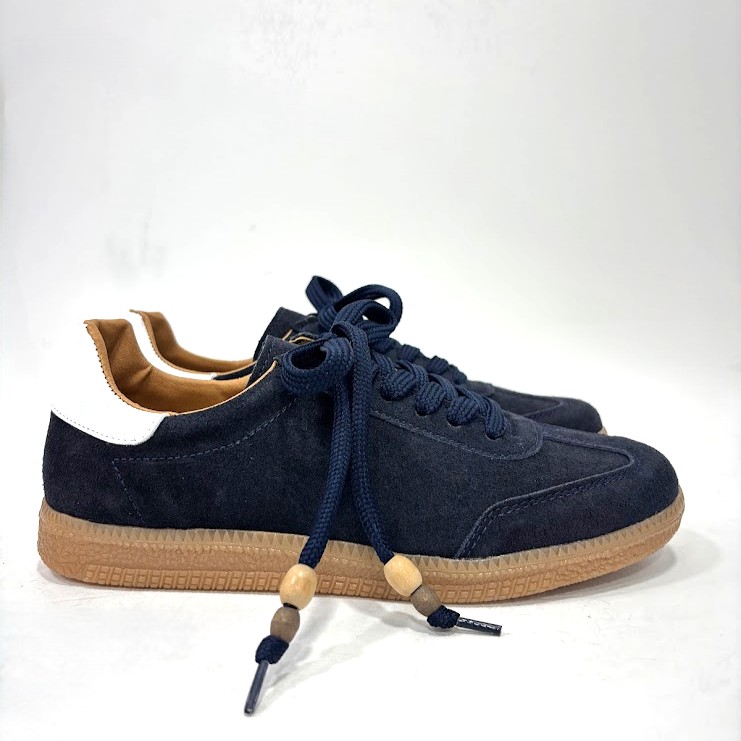Sapato desportivo de Senhora, fabrico poortuguês, em camurça azul e apontamento em branco no calcanhar, com atacador a cor e interior em pele. Sola de borracha.